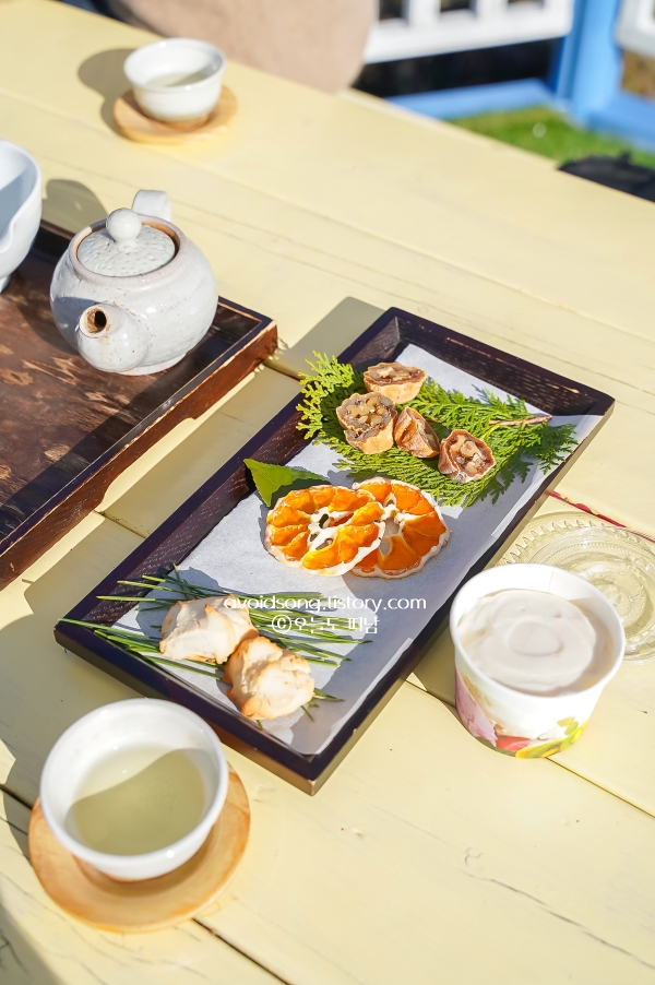 입장료에는 제주 전통차와 다식 체험까지 포함돼 있어요. ‘쉼한모금’이라는 야외 찻자리 공간에서, 미로를 따라 산책한 뒤 전통 찻잔에 담긴 따뜻한 녹차 한 잔을 즐길 수 있답니다. 풍경 보며 마시는 차 한 모금이 힐링 그 자체여서 부모님도 좋아했고 한적하고 정돈된 분위기 덕분에 제주 여행 중 쉼표처럼 들르기 좋은 가을 명소입니다.