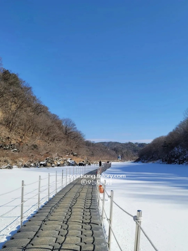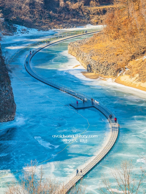 물윗길 특성상 수위나 기상 상황에 따라 당일 이용 구간이 조정될 수 있으니, 현장 안내판에서 오늘 가능한 구간을 먼저 확인하는 방식이 가장 좋다. 짧게 즐기려면 개방된 핵심 구간만 왕복으로 잡고, 길게 걷고 싶다면 전 구간 운영 여부를 확인한 뒤 시간을 넉넉히 두는 편이 좋다. 산책로처럼 보이지만 바람이 협곡을 타고 올라오고, 발밑은 부교라 리듬이 생겨 몸이 금방 달아오른다. 장갑은 선택이 아니라 기본이고 직탕폭포 주변은 물소리와 바위 지형이 함께 들어와 겨울의 맛이 진하게 남는다. 1월 중순 전후로 한탄강 일대 겨울 트레킹 행사와 연계 안내가 붙는 해도 있어, 물윗길과 묶으면 겨울 강원도 여행으로 더 알찬 경험을 할 수 있다.