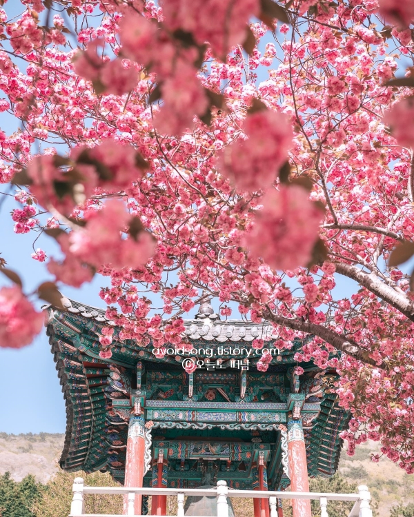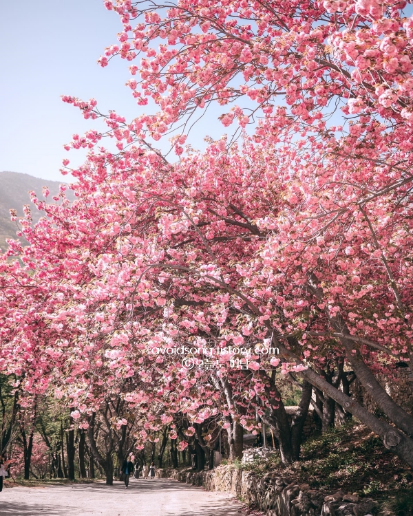 겹벚꽃이 주는 특별한 분위기에 감탄하게 되는 경상도 봄여행 가볼만한곳 베스트 10으로 한참을 걸어도 계속해서 벚꽃이 이어지는 길, 그리고 절 마당 한가운데에서 올려다보는 꽃잎 가득한 하늘. 바람이 불면 꽃잎이 천천히 흩날리는 모습이 참 아름답습니다. 저는 벚꽃도 좋지만, 겹벚꽃은 정말 색다른 매력이 있는 것 같습니다.