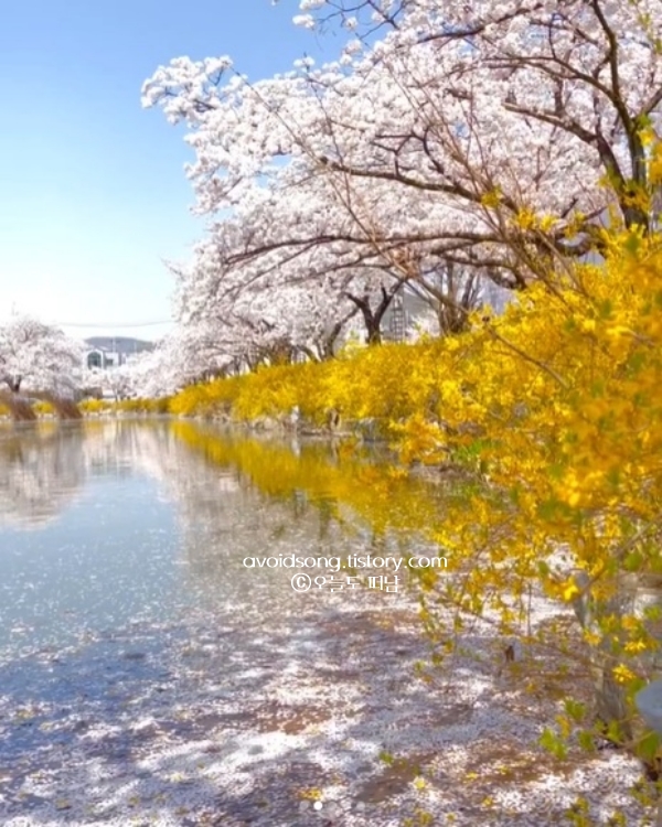 김천 연화지는 봄이 되면 벚꽃이 호수 주변을 가득 채워 환상적인 풍경을 만들어내는 경상도 봄여행 가볼만한곳 베스트 10입니다. 개화 시기는 3월 말에서 4월 초로, 호수 둘레길을 따라 흐드러진 벚꽃이 피어나죠. 절정시기에는 일부 도로를 '차 없는 거리'로 운영해서 한층 더 여유롭게 벚꽃을 감상할 수 있습니다. 낮에는 푸른 하늘 아래 만개한 벚꽃을 거닐기 좋고, 밤이 되면 은은한 조명이 더해지고 벚꽃이 절정에 이르면 개나리도 함께 피어나 노란빛과 분홍빛이 어우러지는데, 그 모습이 참 아름답습니다.