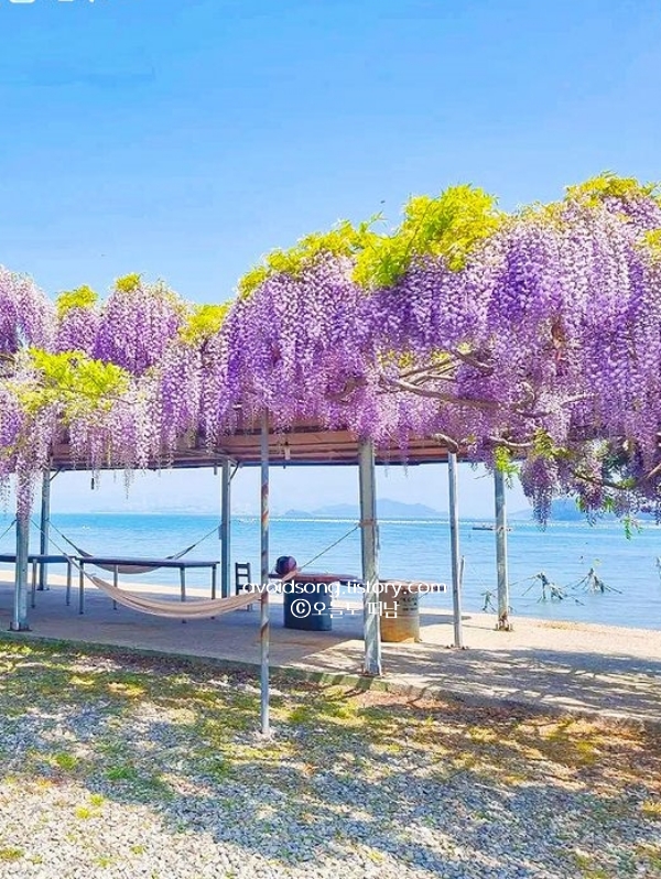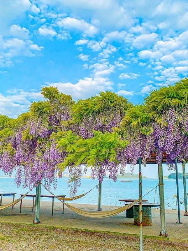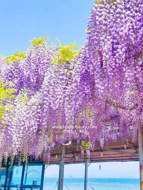 작년에 이곳을 찾았을 때, 등나무 터널 아래서 잠시 머물며 그늘 속의 시원한 공기를 즐겼던 기억이 납니다. 등나무꽃은 가까이서 보면 작은 꽃잎들이 촘촘하게 모여 있어 더욱 신비로운 느낌을 주는데, 바람이 불 때마다 꽃잎이 떨어지며 길을 따라 흩날리는 모습이 정말 아름다웠습니다. 마을을 따라 천천히 걷다 보면 어느새 바다가 나타나는데, 푸른 바다와 보랏빛 꽃이 함께 어우러진 풍경은 이곳에서만 만날 수 있는 장면입니다.