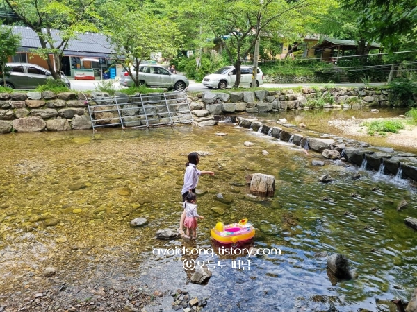 아침 7시부터 운영되지만 주말 오전 10시만 넘어도 자리가 없을 만큼 인기라 일찍 서두르는 게 좋고, 늦으면 멀리 주차해야 하는 점도 고려해야 합니다. 큐브 바람 넣는 곳도 따로 있고, 나무젓가락을 유료로 판매할 정도로 방문객이 많다 보니 미리 준비해 가면 실속 있게 즐길 수 있습니다. 평상은 4만 원 선이며 식당가 주변에 샤워장과 탈의실이 있긴 하지만 간단한 세척용도로만 생각하면 되고, 냇가에 가까운 형태라 흐름도 잔잔해 아이들 물놀이에 적합합니다.