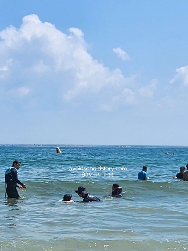 길이만 해도 약 3.8km에 달해 해안선을 따라 걷기만 해도 힐링이 되고, 실제로 맨발로 해변을 걷는 분들을 아침부터 많이 볼 수 있었어요. 물은 맑고 시원했으며, 파도가 적당히 높아 물에 몸을 맡기고 놀수 있는데 튜브는 7,000원, 샤워장은 2,000원이었고, 공영주차장은 무료로 운영되고 있어 접근성도 괜찮았습니다.