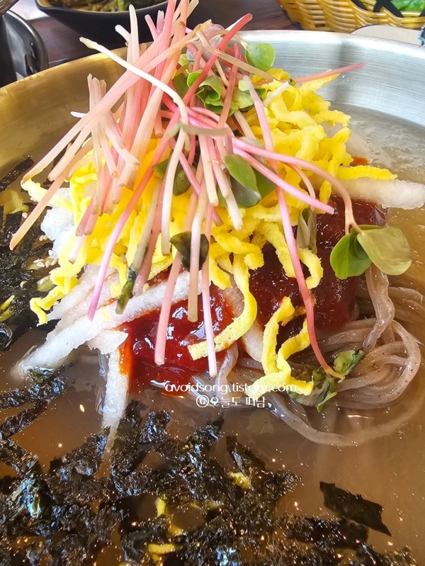 워낙 유명한 곳이라 점심시간에는 대기가 있을 수 있지만, 넓은 매장과 빠른 서비스 덕분에 기다림이 지루하지 않아요. 변함없이 푸짐한 양과 한결같은 맛을 유지하고 있어서 현지인들은 물론 여행객들에게도 만족도가 무척 높습니다. 막국수 위에 듬뿍 올라간 새싹채소의 싱그러움과 치킨의 육즙이 어우러진 이 맛은 충주 여행을 마무리하는 가장 완벽하고 행복한 한 끼가 되어줄 거예요.