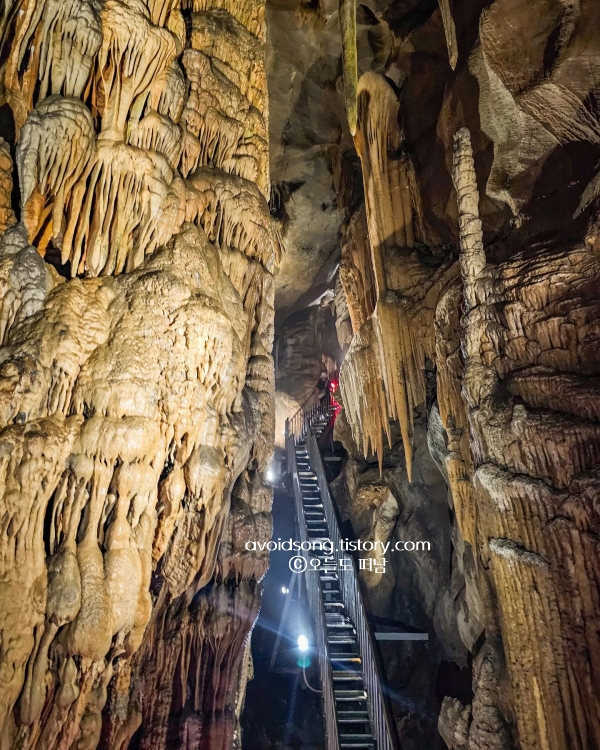 단양 고수동굴은 총 길이 약 1.7km로, 입장에서 출구까지 약 40분 정도 소요된다. 내부는 일정 구간마다 계단이 반복되는데, 전체적으로는 아이와 함께 걷기 무리 없었고 계단 수가 700개 가까이 된다고 알려져 있지만, 중간중간 쉬어갈 수 있고 천천히 이동하면 어렵진 않았다. 바닥은 미끄러운 구간이 있으니 운동화는 필수다. 동굴 안은 인공조명이 잘 설치되어 있고, 형상마다 이름이 붙어 있어 아이와 이야기 나누기 좋았던 충청도 실내 가볼만한곳 베스트 10이다.
