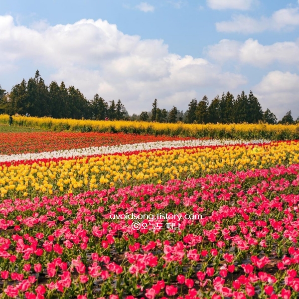 튤립의 개화 시기가 짧기 때문에 4월 초중순이 가장 좋은 시기다. 배경이 되는 오름과 맞닿아 있어 꽃을 감상하면서도 제주의 탁 트인 풍경을 함께 즐길 수 있다는 점이 매력적이다. 입구를 지나면서부터 넓게 펼쳐진 튤립밭과 유채꽃밭이 이어지고, 곳곳에 포토존도 마련되어 있어 사진 찍으며 여유롭게 돌아보기 좋다. 제주의 봄을 제대로 만끽하고 싶다면, 이곳에서 형형색색의 튤립과 유채꽃을 함께 감상해보자.