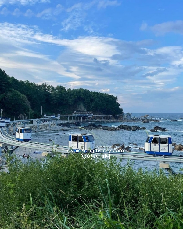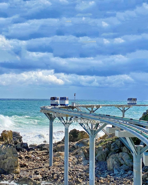 죽변해안에 위치한 스카이레일은 멋진 해안선을 따라 레일이 놓여 있고, 레일 위를 4인승 작은 기차가 자동으로 움직이는 시스템이다. 레일차는 일행만 탑승하기 때문에 프라이빗하게 감상할 수 있어서 좋았던 6월 국내 가족여행지 추천이고 전체 운행 시간은 대략 30분 정도였는데, 바다 물색이 정말 예뻐서 눈을 뗄 수가 없었다.